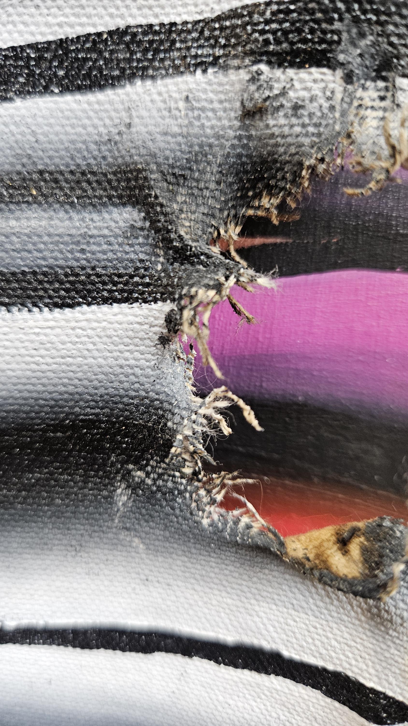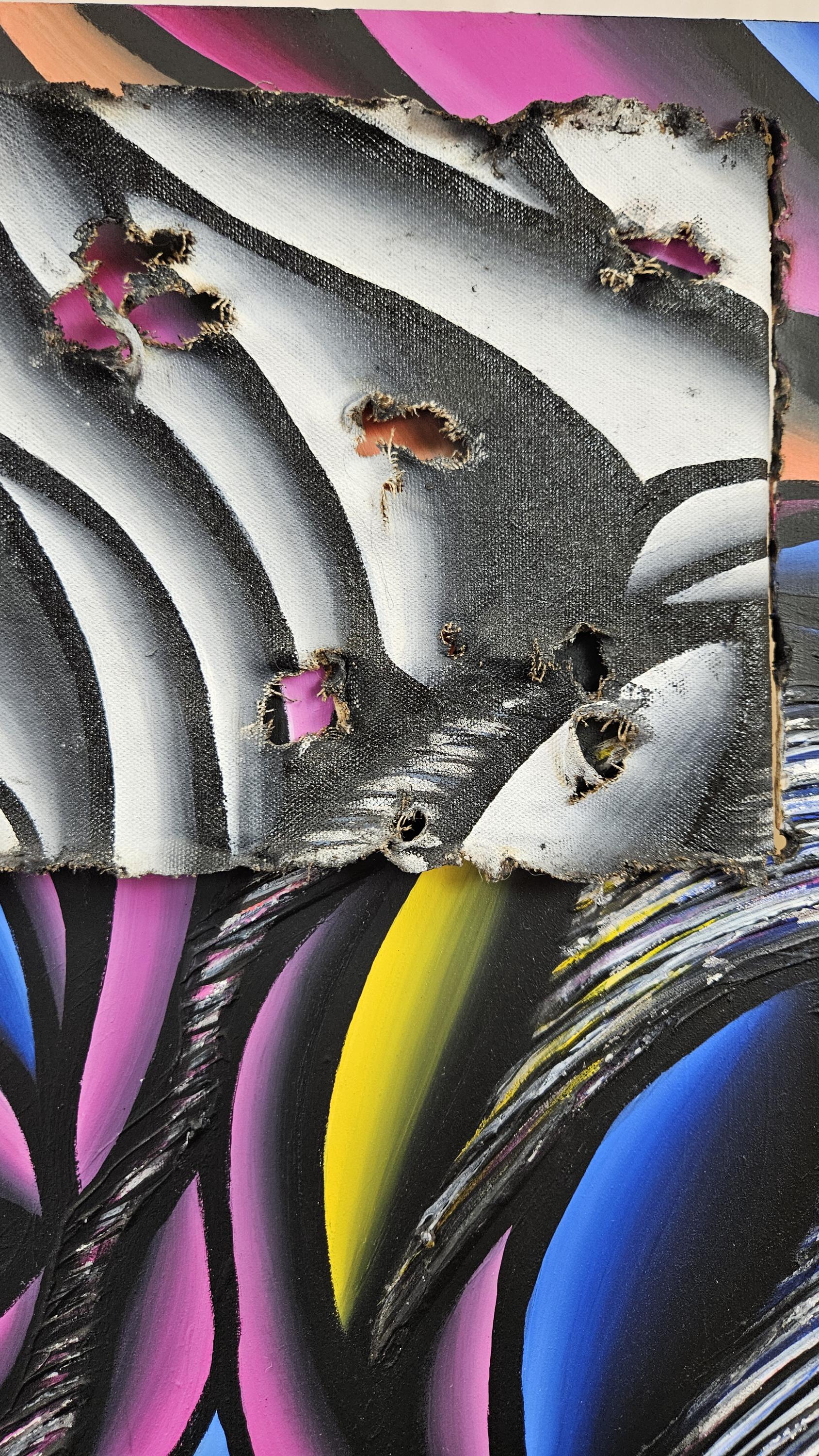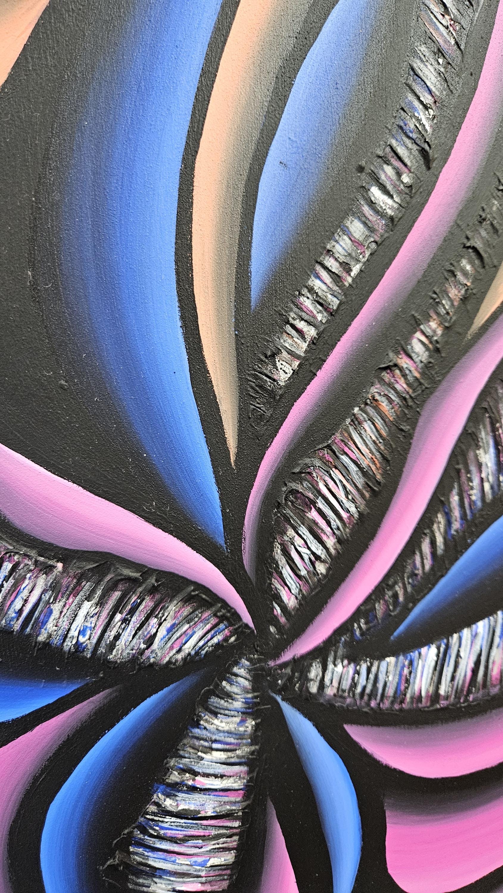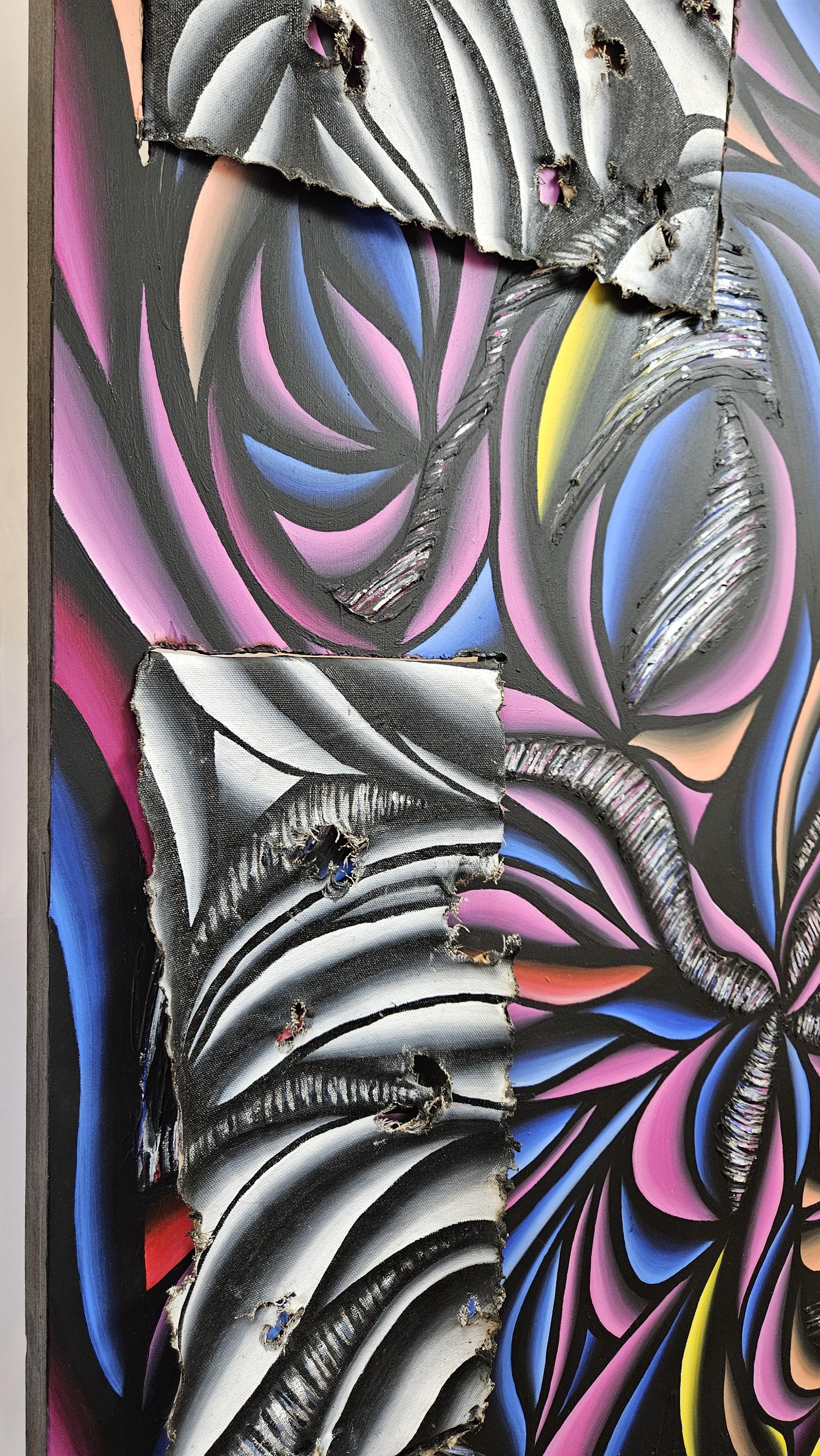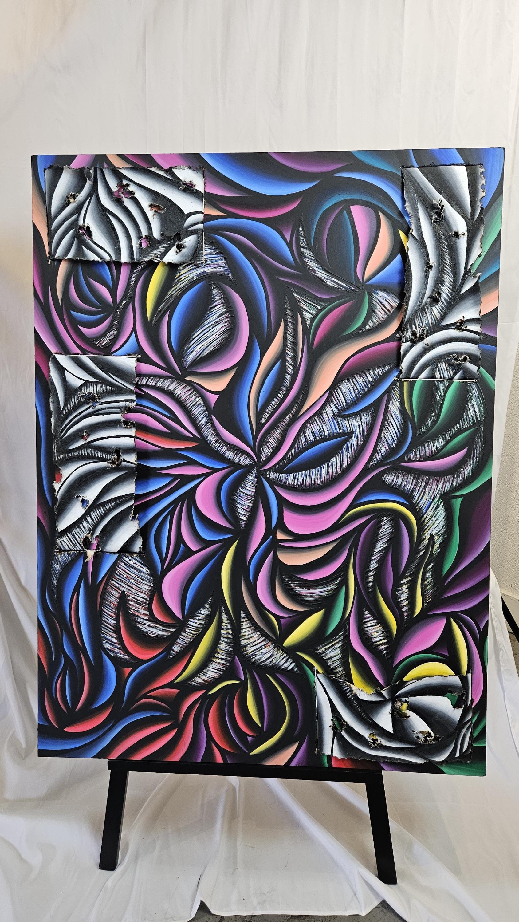 Created on a 36x48 inch wood panel with 1.5 inches of depth. I began my process with laying down a few layers of gesso for base. I then cut and burned through the wood panel to make slats for the canvas. next came the sculpting. I put down molding paste, and sculpted out a large swirling vortex, for extra texture. finally, I could begin painting. laying down my base colors of bright bold colors blending them together to create an immerging visual. adding some stunning silver leaf to the sculpted areas, for a tinge of sheen. Now coming back in, with the acrylic paint. Perfecting the shading and lines on the sinewy petals. Now on the canvas. Each canvas was painted in monotone black and white for contrast. This time hit with a silver leafing. I then burn through the canvas and it's edges and stretched it through the wood panel. Allowing glimpse of the bases to show through.