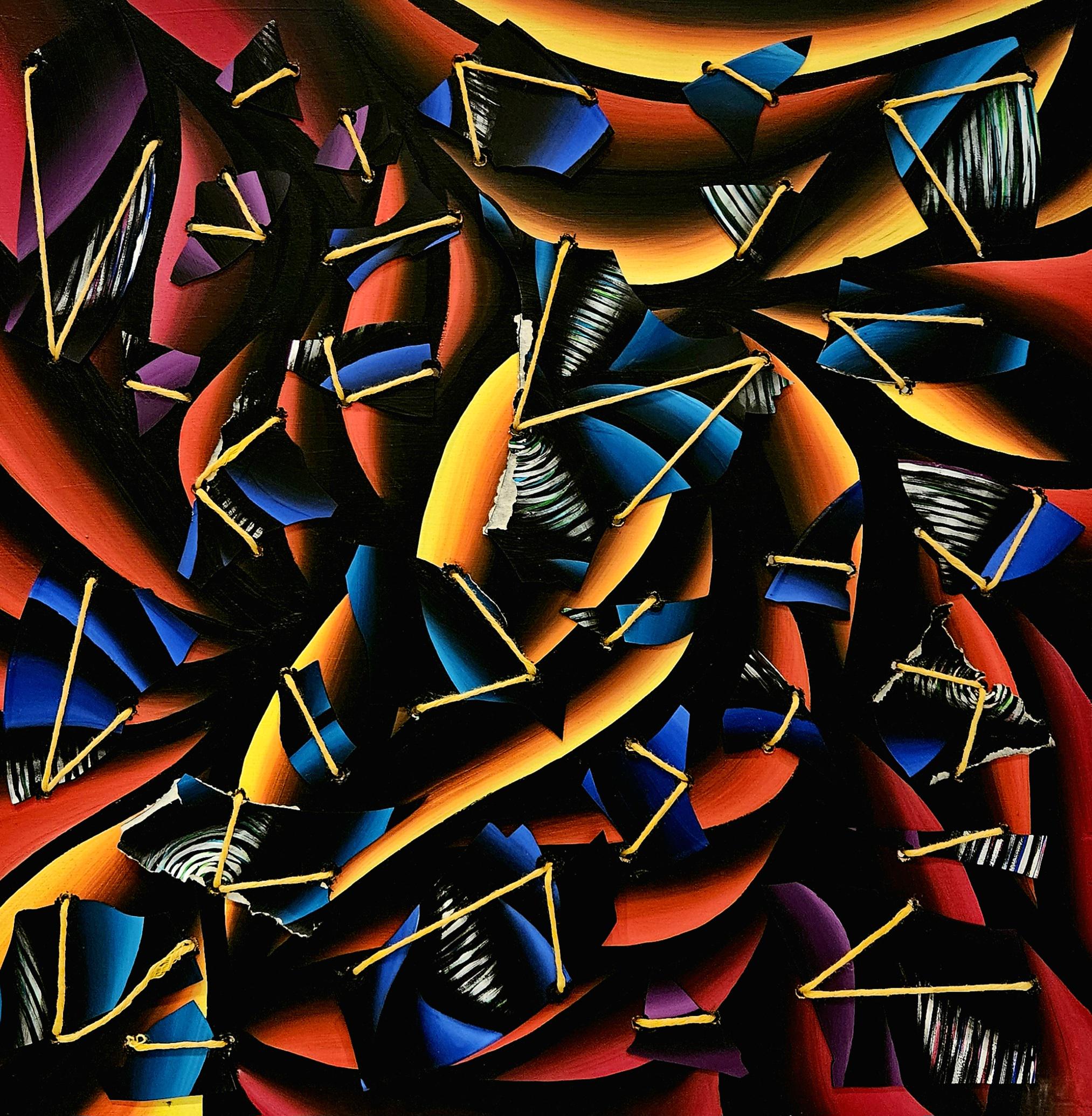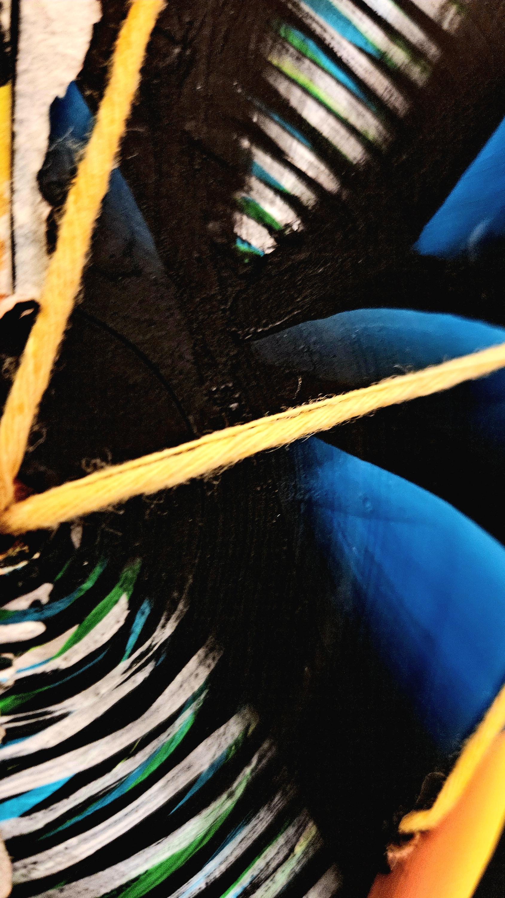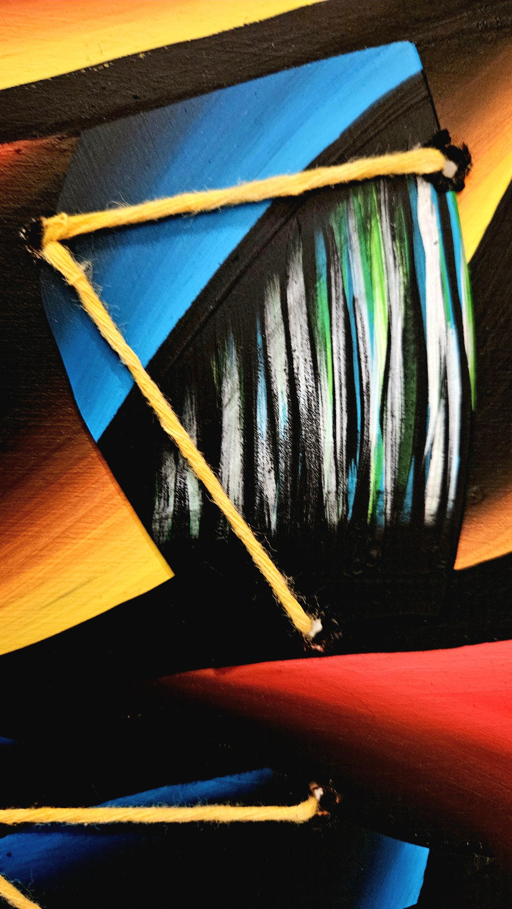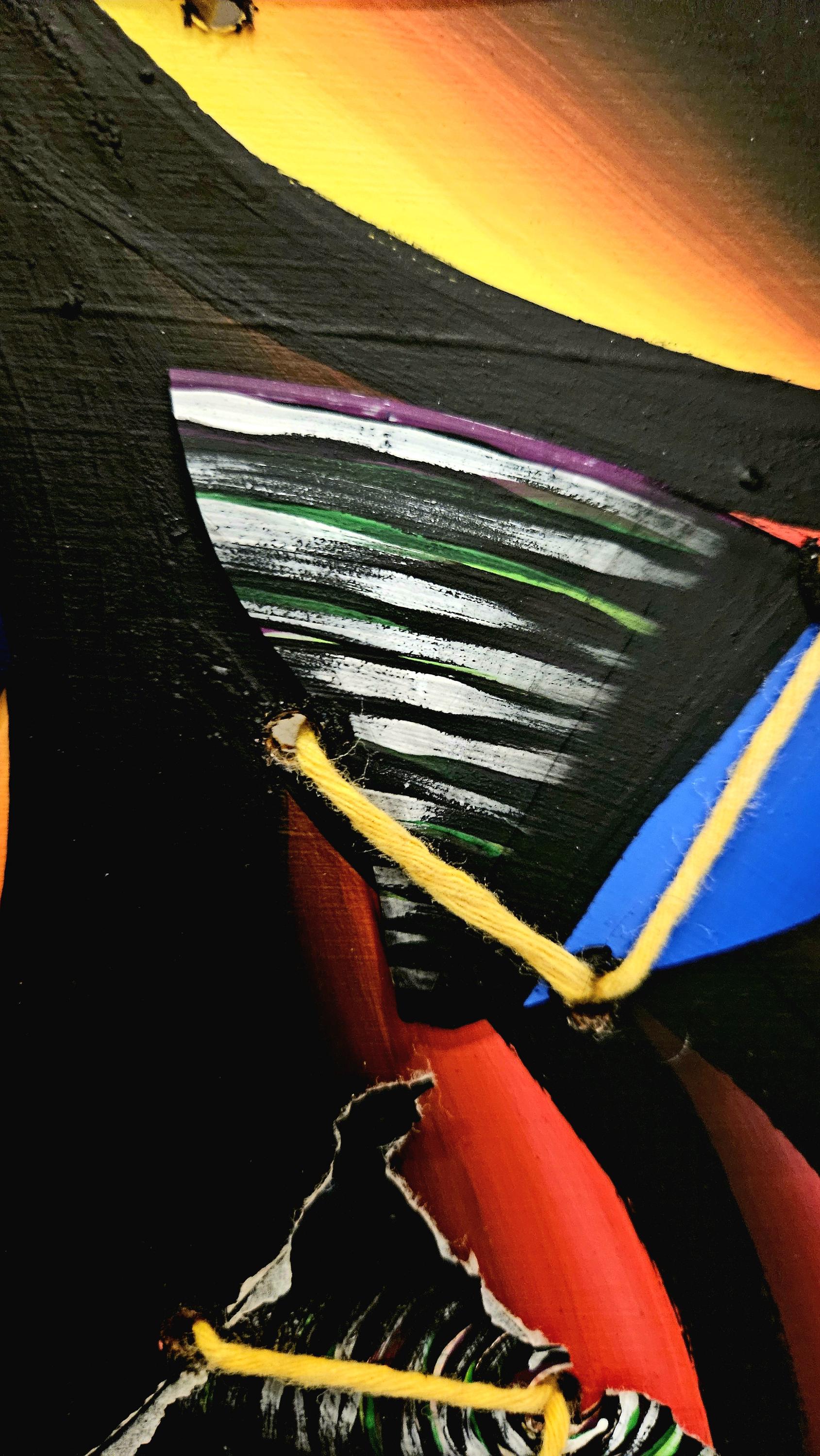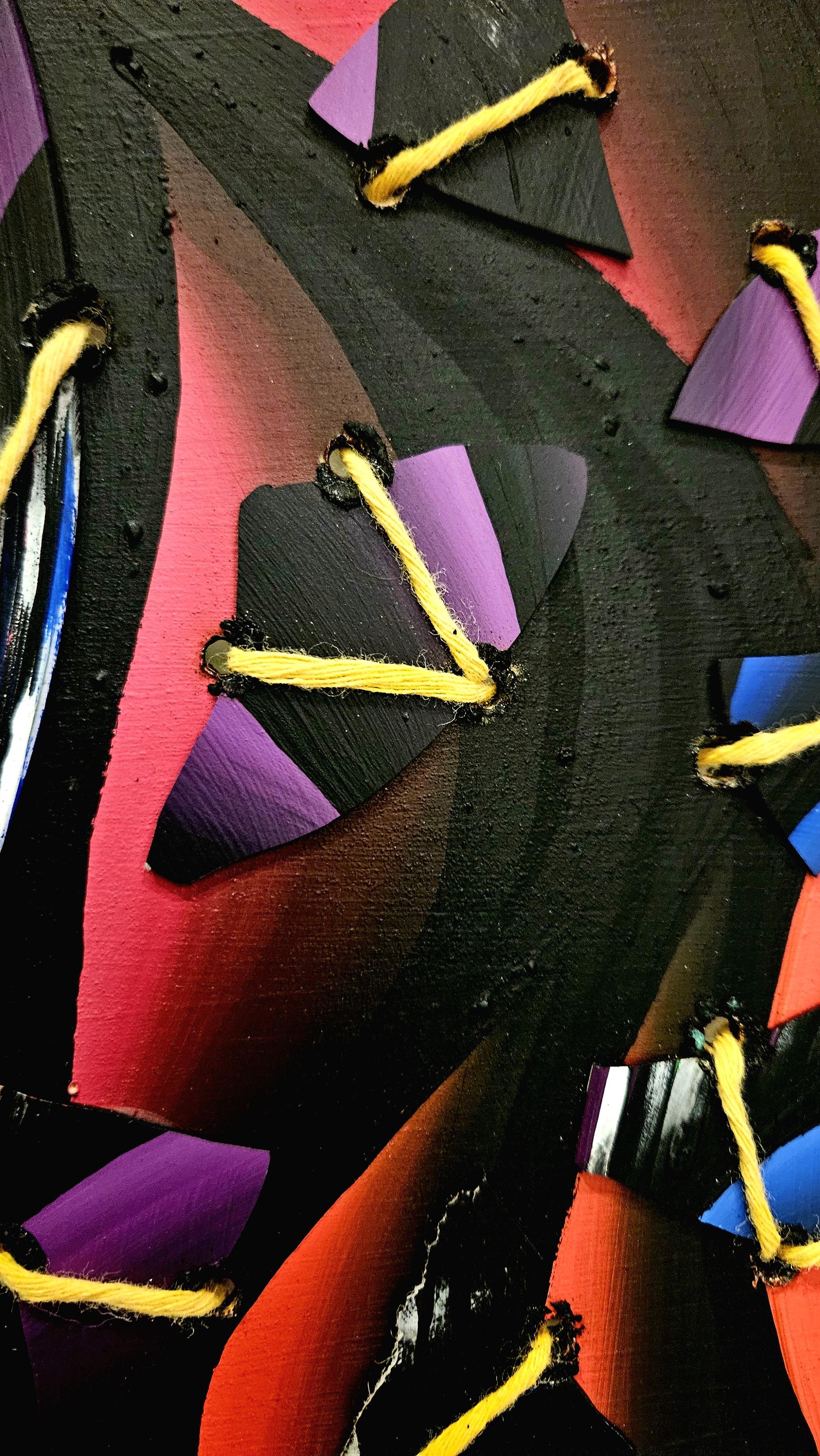 - **Medium:** Acrylic, UV-activated paint on wood panel with upcycled vinyl albums