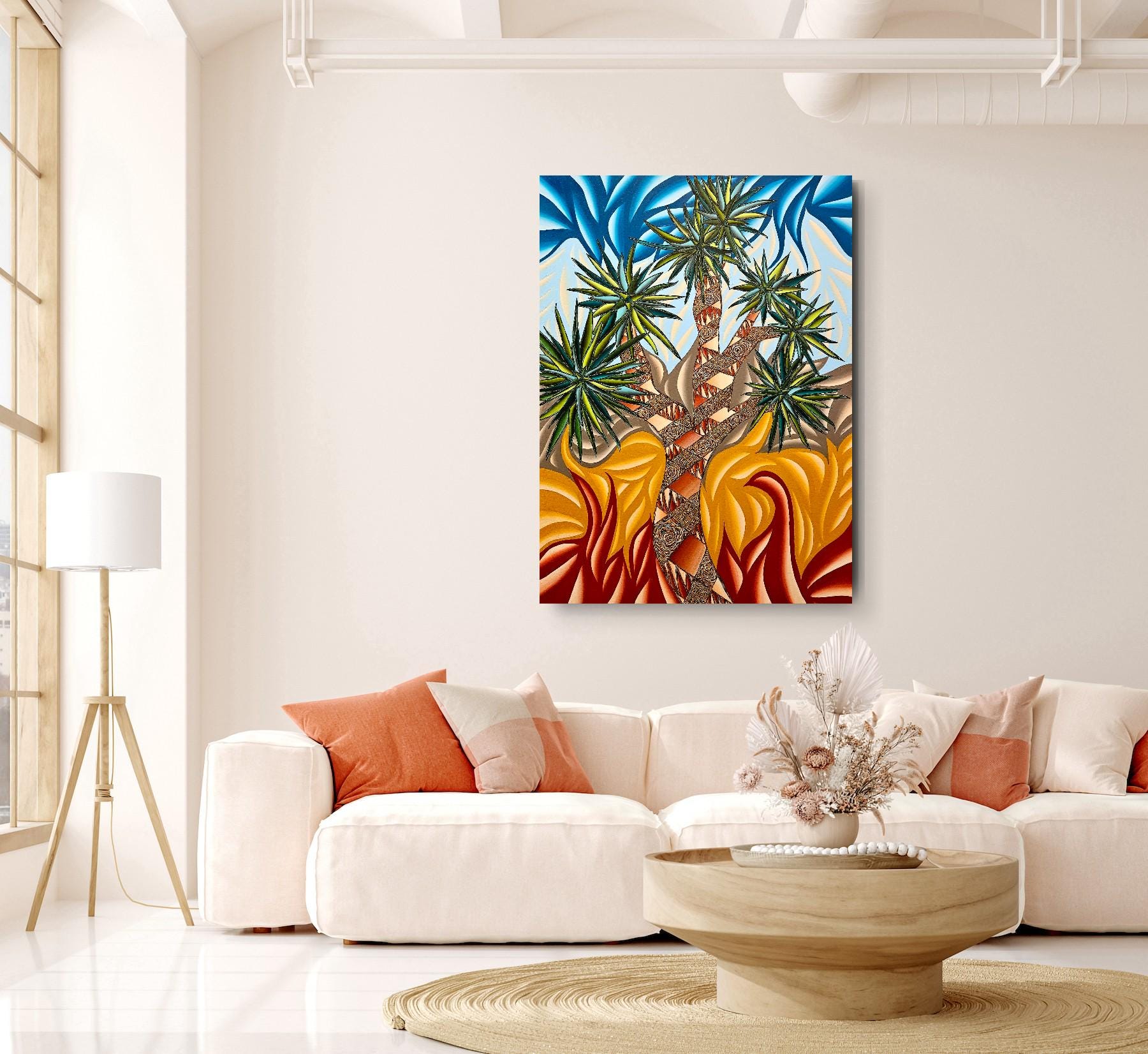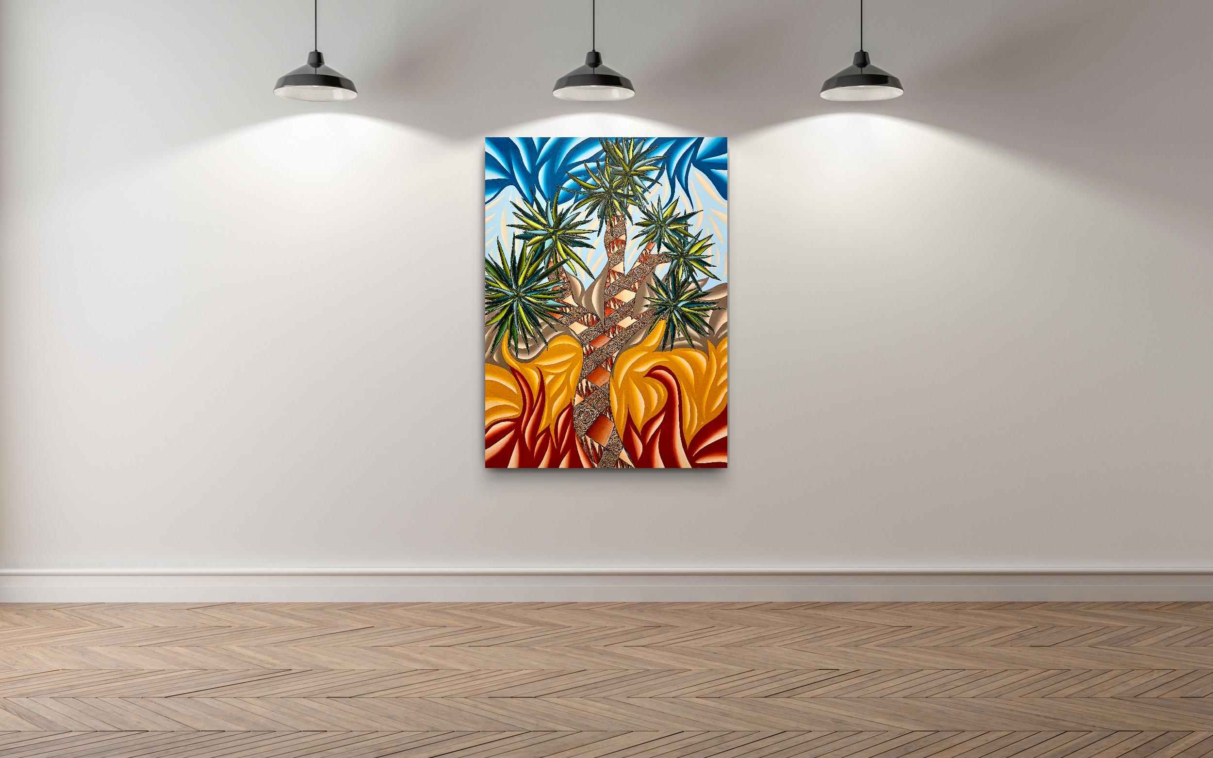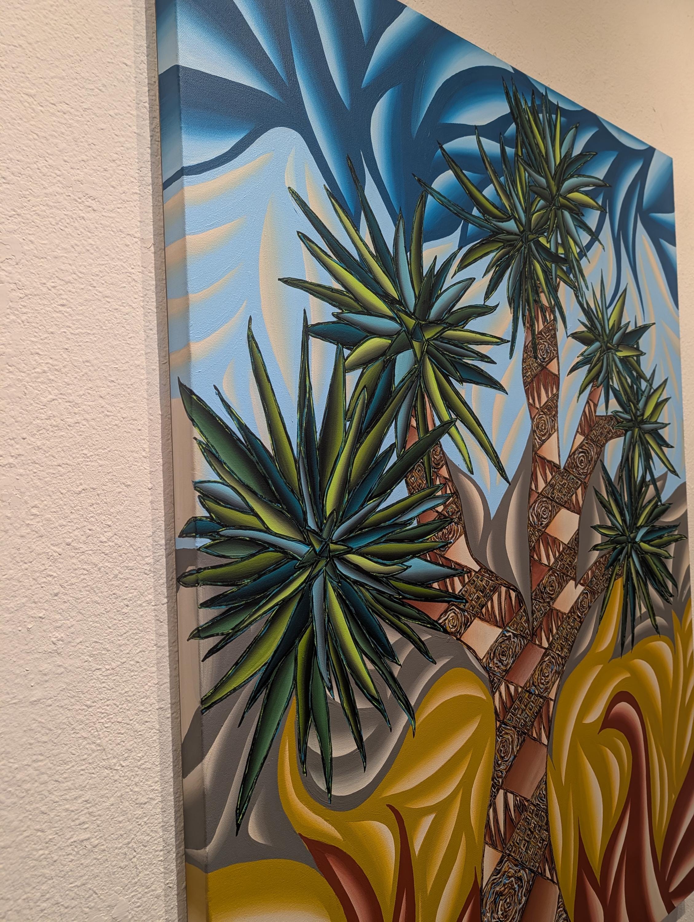 Immerse your audience in a bold dialogue between desert resilience and explosive color. This large-format acrylic piece captures a stylized Joshua Tree scene rendered in vibrant, saturated tones and kinetic patterns. The composition juxtaposes carved, textured trunks with electric sky swirls and heat-pressed foliage, creating a dynamic tension that pulses with energy and movement.