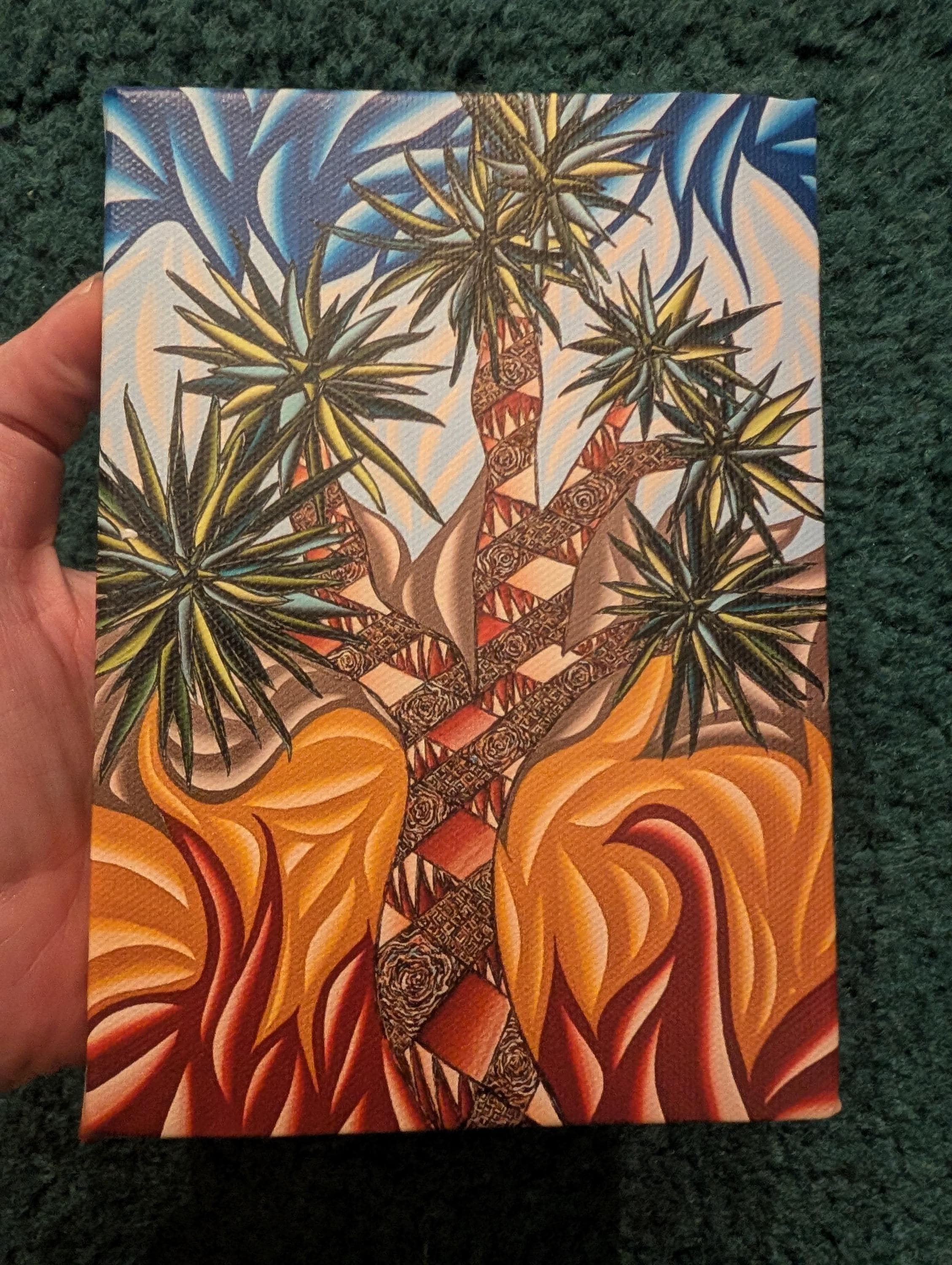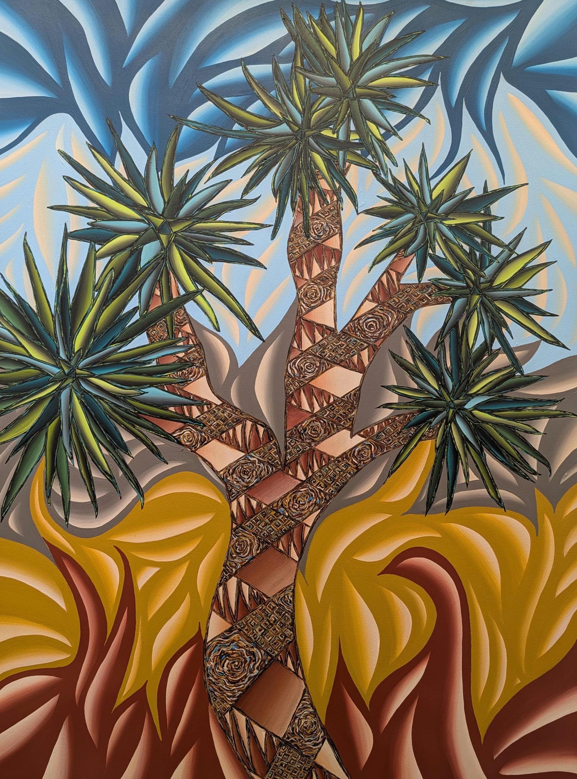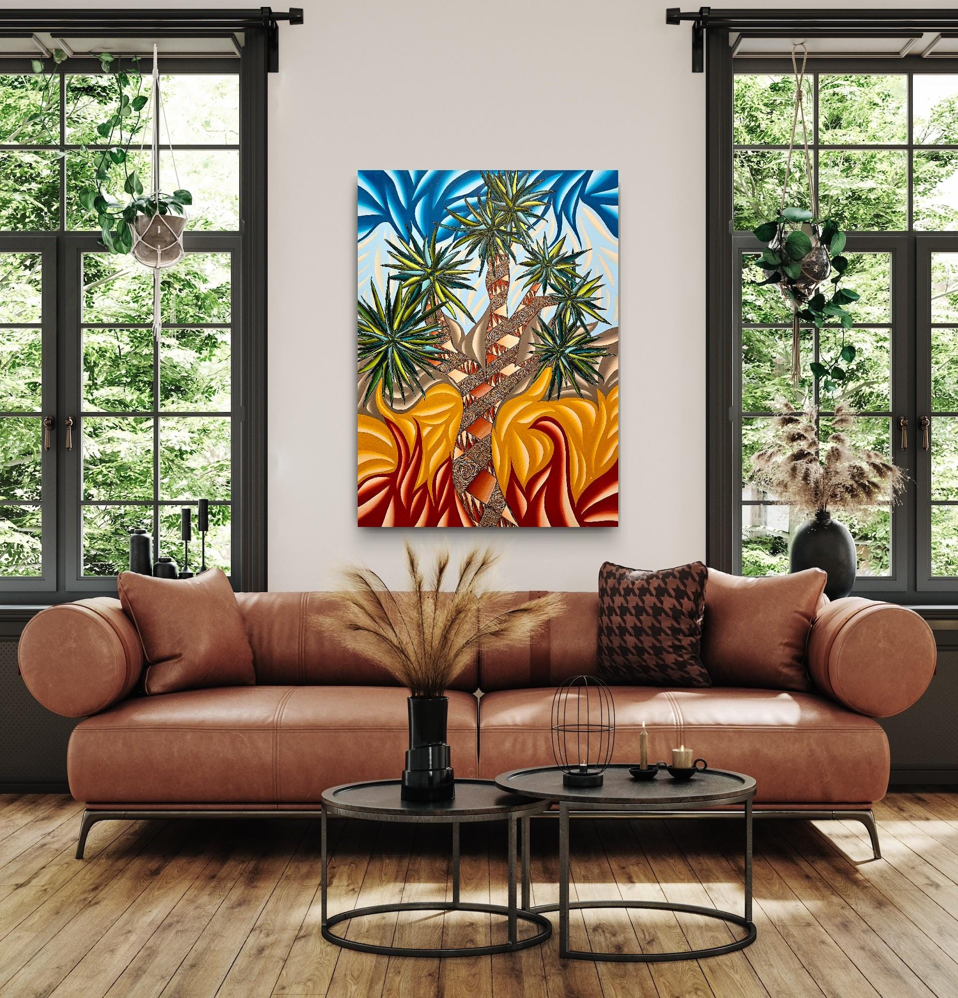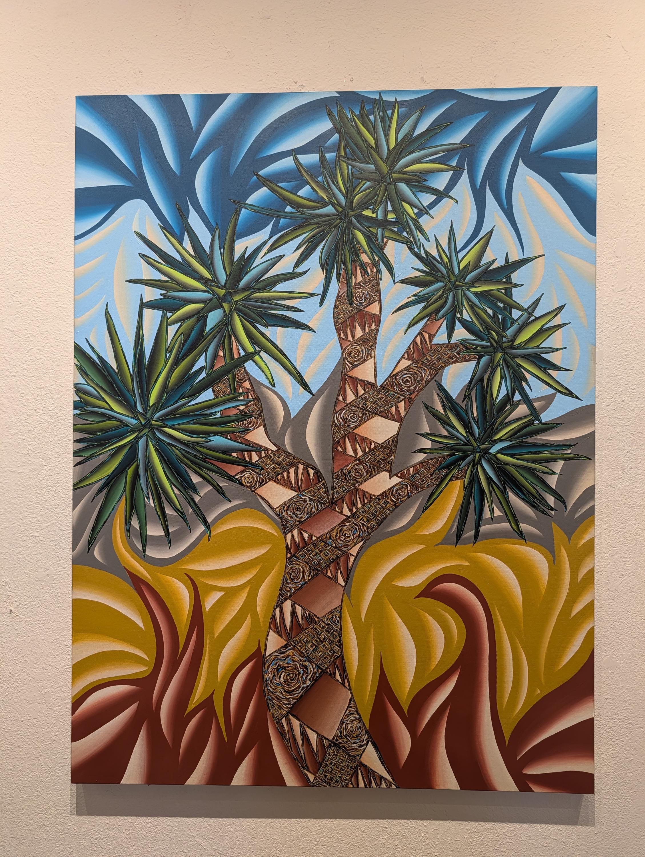 Immerse your audience in a bold dialogue between desert resilience and explosive color. This large-format acrylic piece captures a stylized Joshua Tree scene rendered in vibrant, saturated tones and kinetic patterns. The composition juxtaposes carved, textured trunks with electric sky swirls and heat-pressed foliage, creating a dynamic tension that pulses with energy and movement.