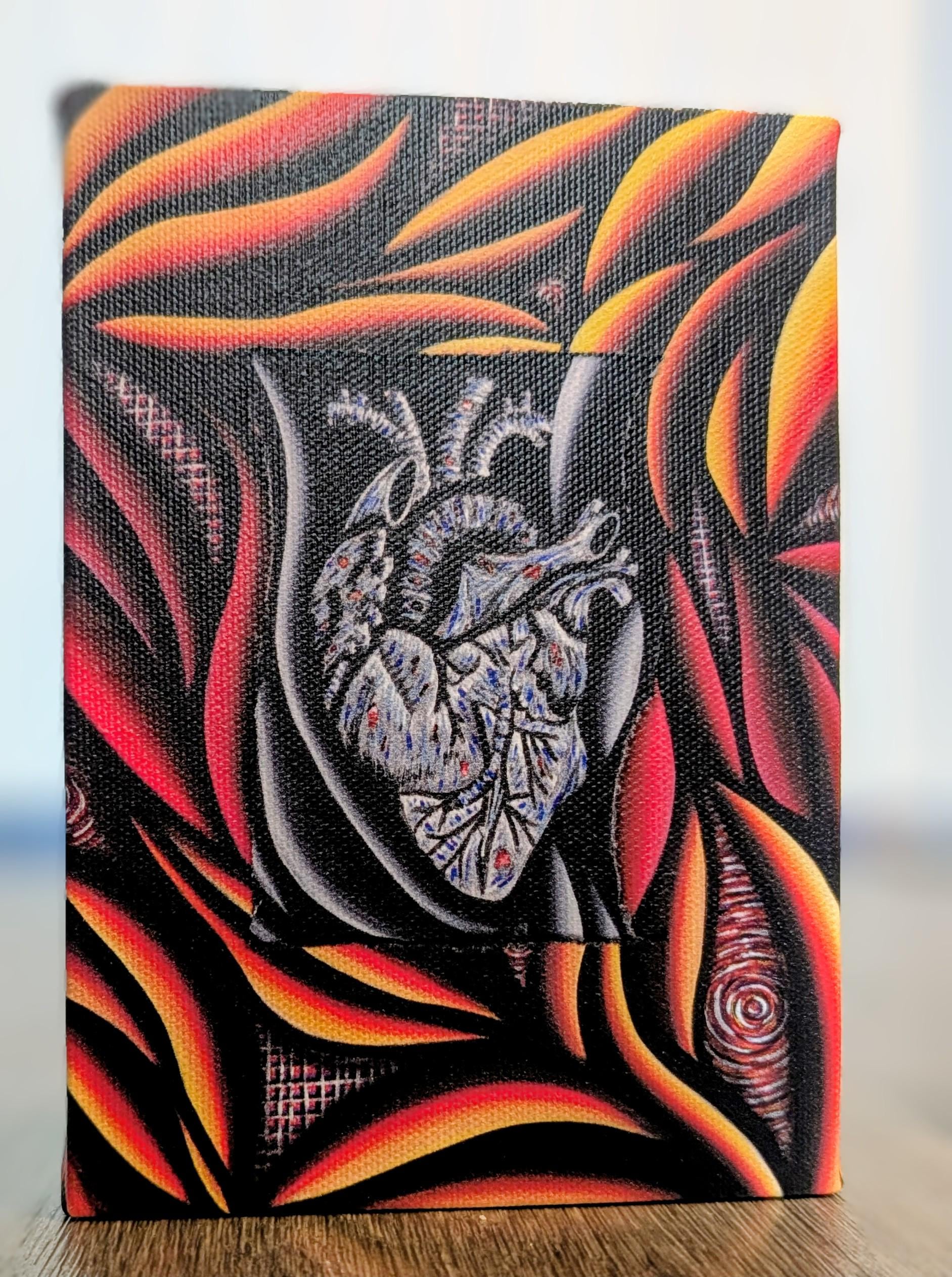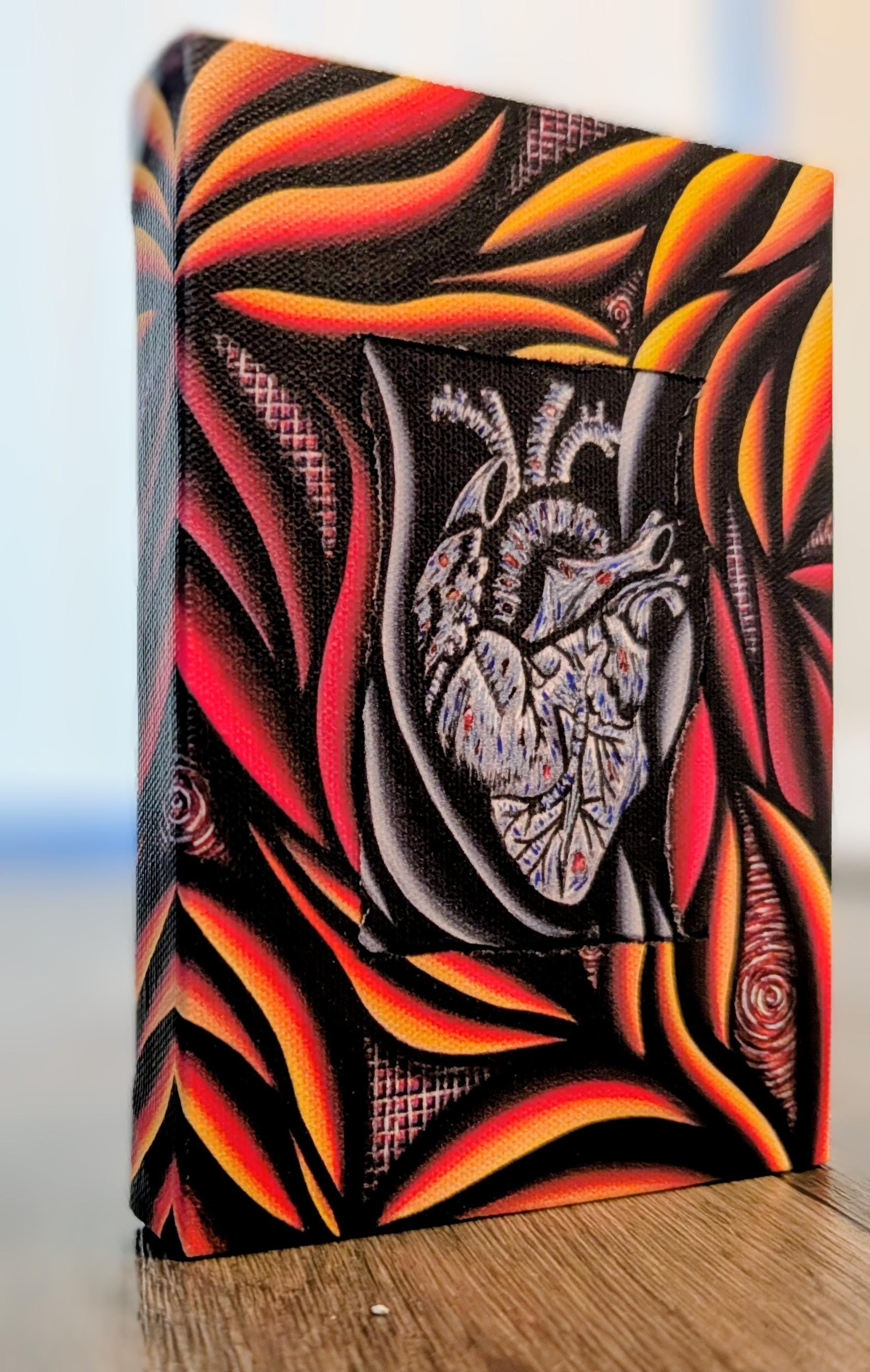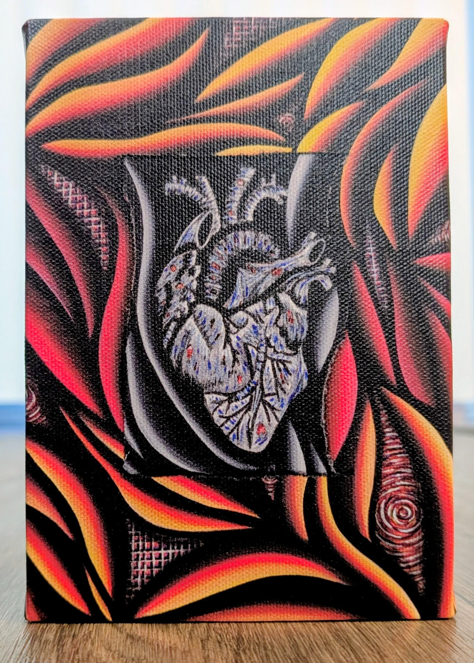 A bold fusion of abstract energy and anatomical truth, this piece features a luminous, stylized heart at the center, rendered in pale, skeletal blues and whites. Surrounding it, flowing ribbons of heat—fiery oranges, reds, and yellows—arc and swirl across a deep, textured black backdrop. The composition marries maximalist abstract expressionism with a meticulous, almost anatomical precision, creating a striking contrast between vulnerability and power. The result is a dynamic, flame-lit portrait that invites the viewer to feel the pulse of color and form.