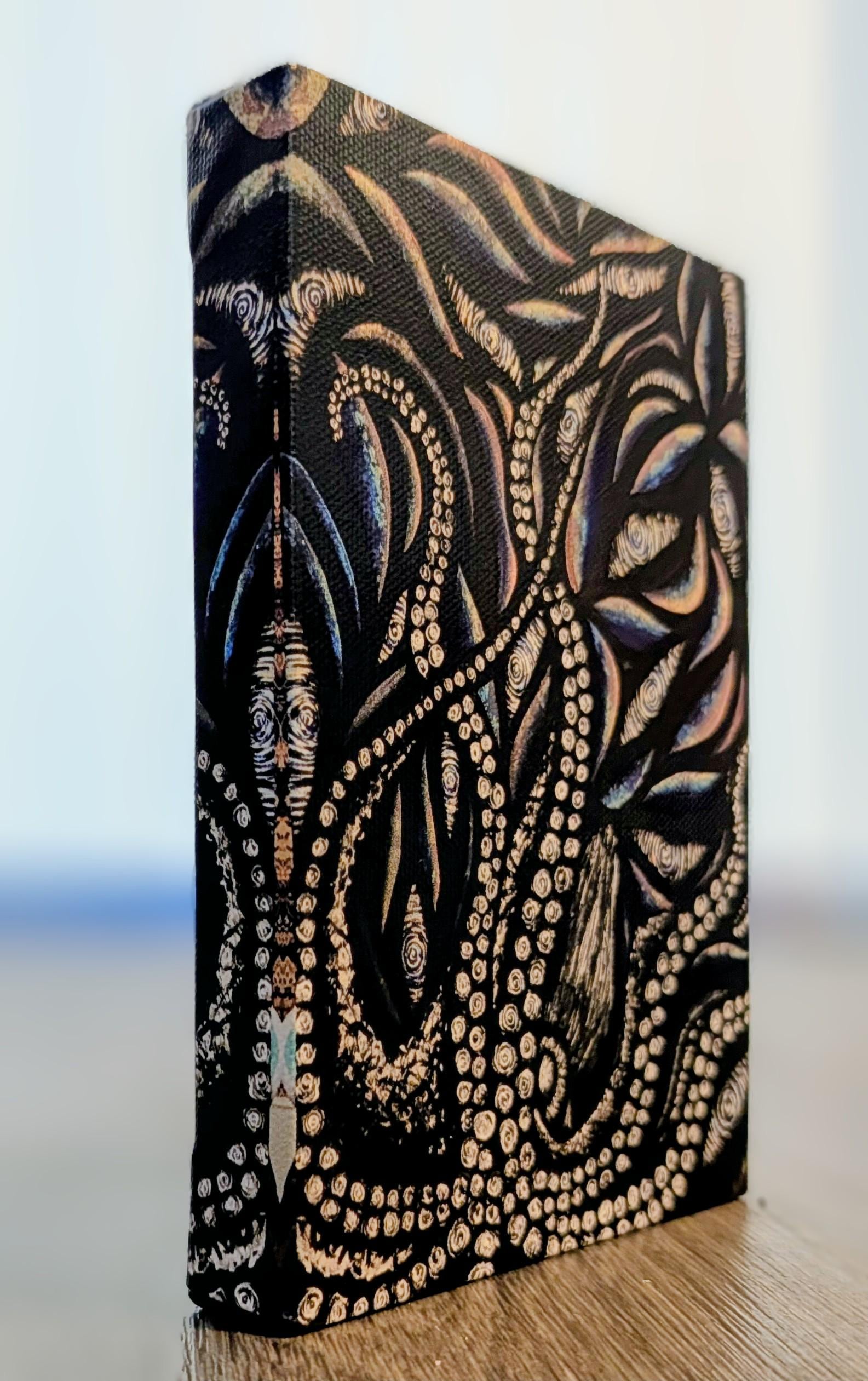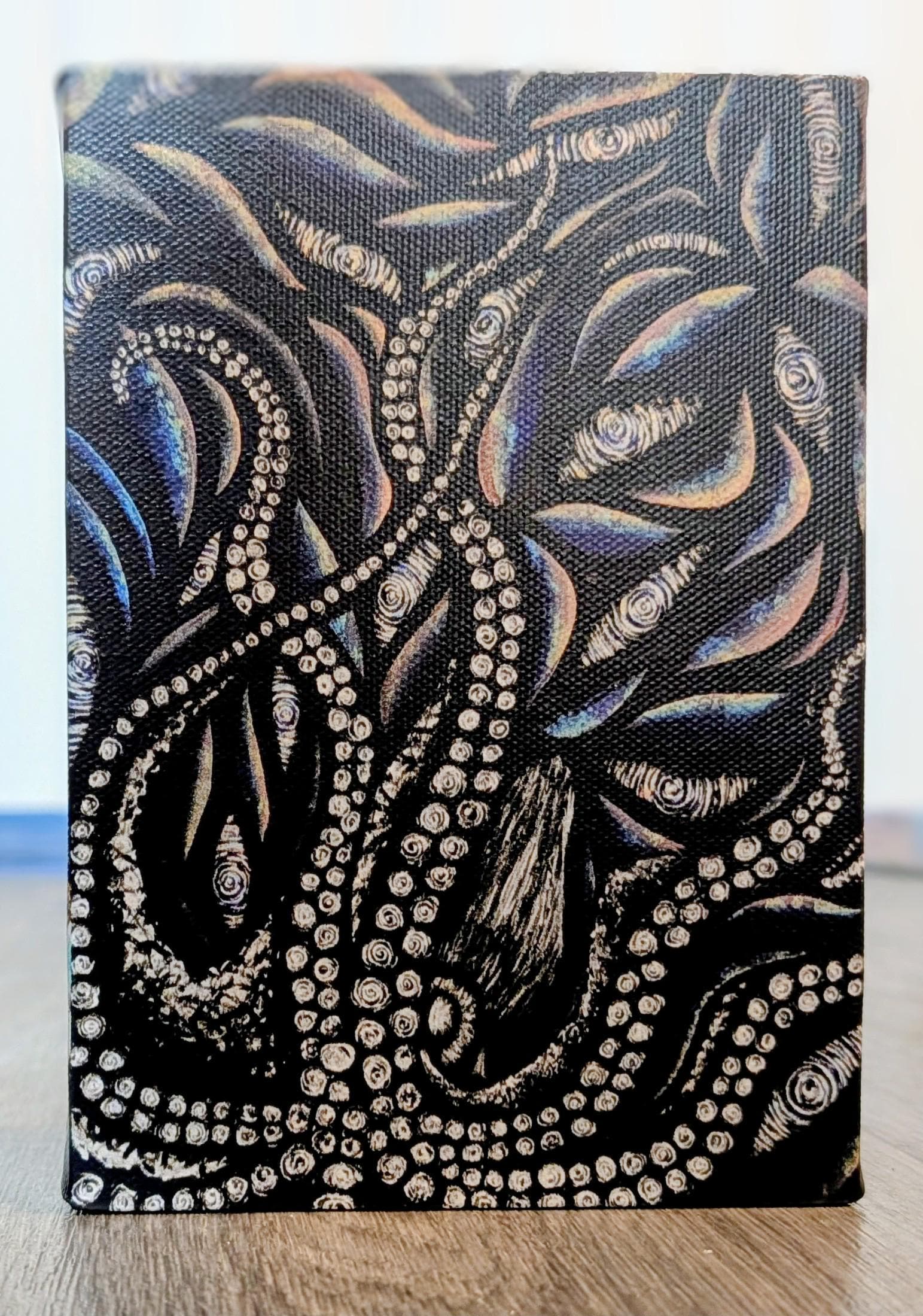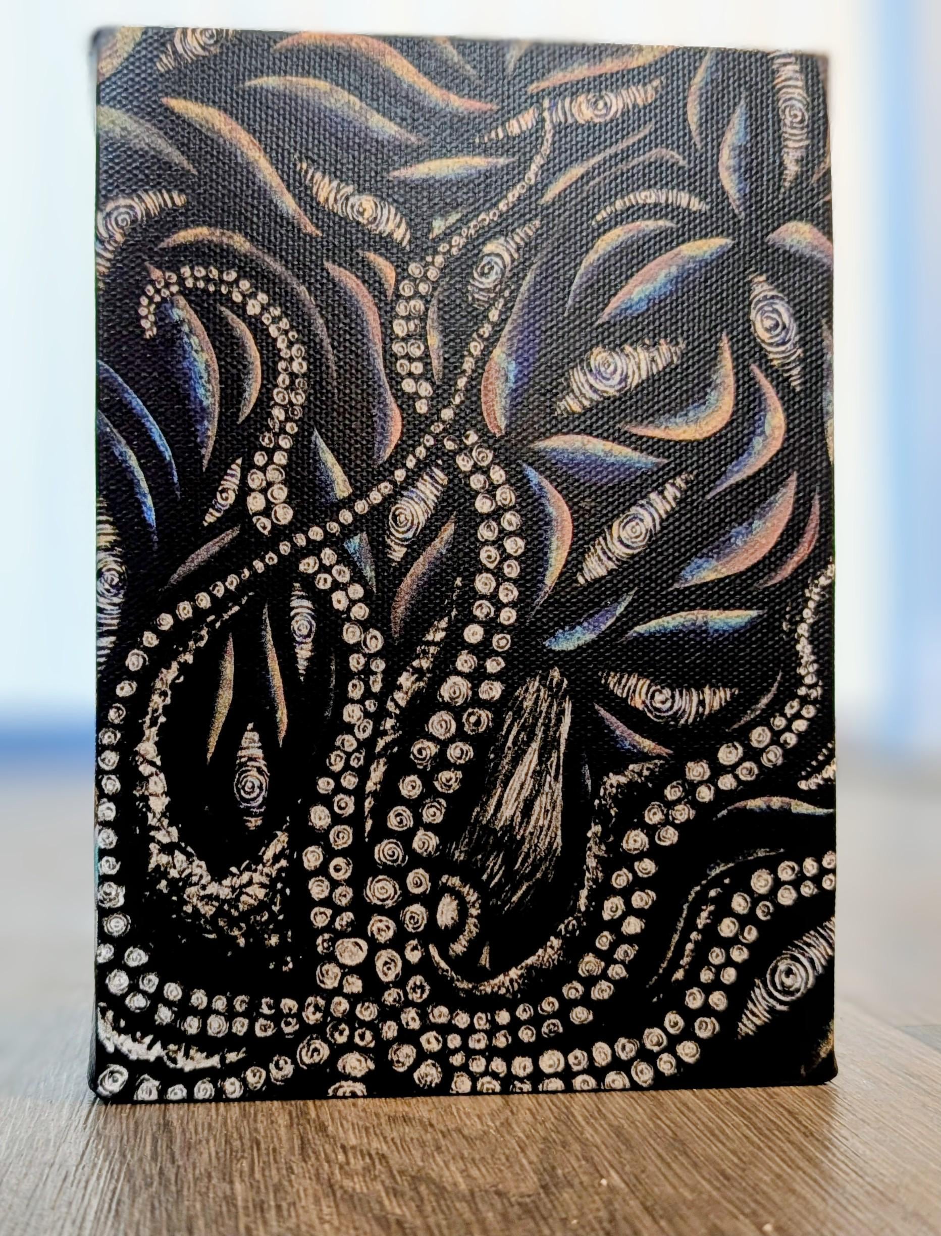 Beneath a storm of midnight hues, this maximalist abstract expressionist piece unveils a bold, living tide. A fearless tusaud-like octopus coils through the canvas, its tentacles studded with luminous beads that shimmer like galaxies. The background erupts with iridescent streaks and swirling spirals, weaving a kinetic dialogue between shadow and light. Textured brushwork and a nocturnal palette create depth and movement, inviting the viewer to dive into a dreamscape where fluid forms become a language of emotion. Created by Bex Nikols, co-owner of Vivid Gallery, Las Vegas, this work exudes the signature tension of chaos and beauty that defines contemporary abstract expressionism.