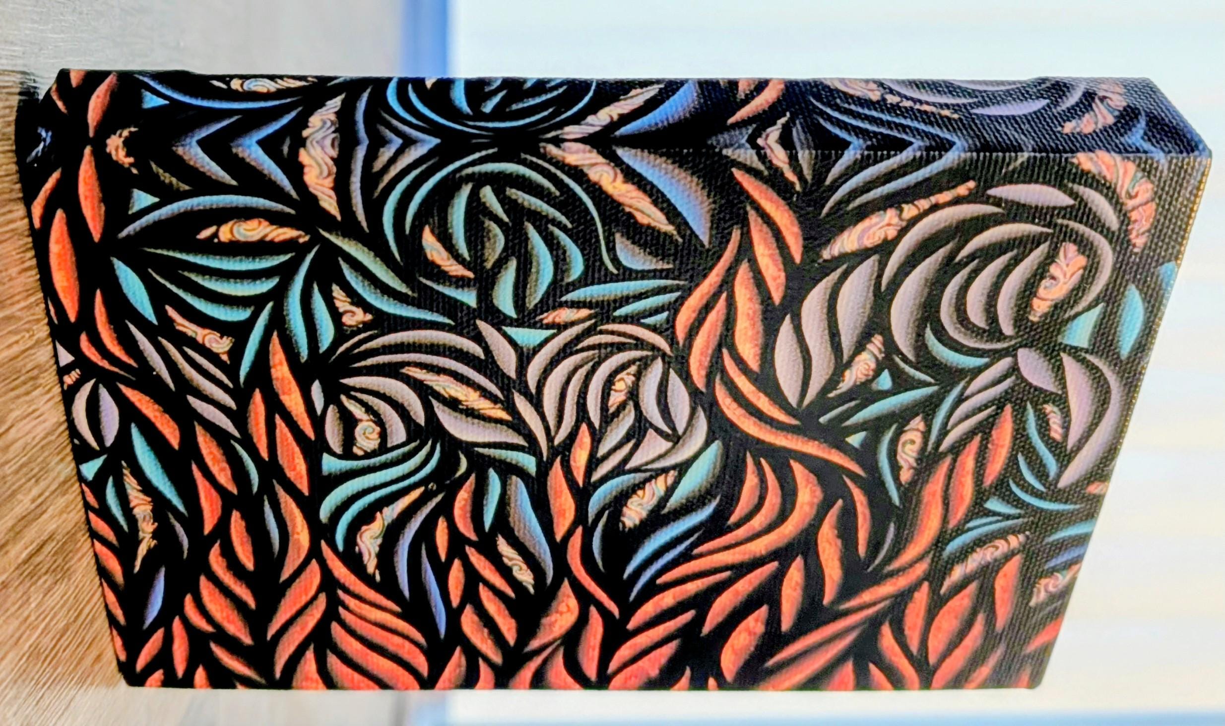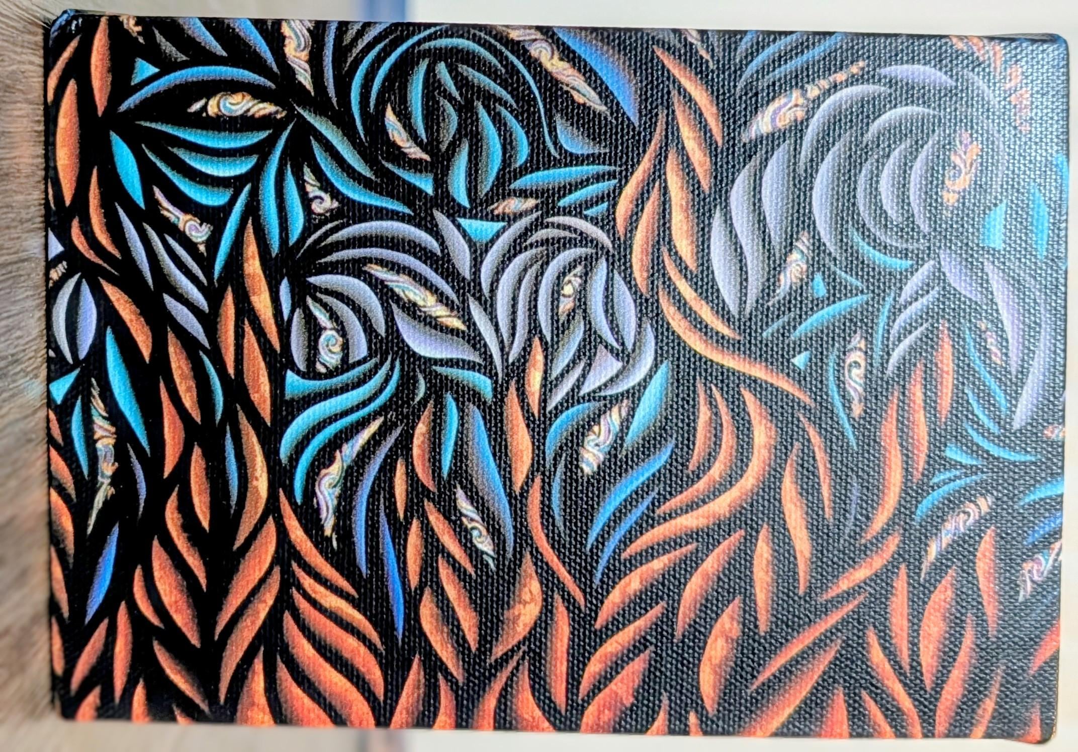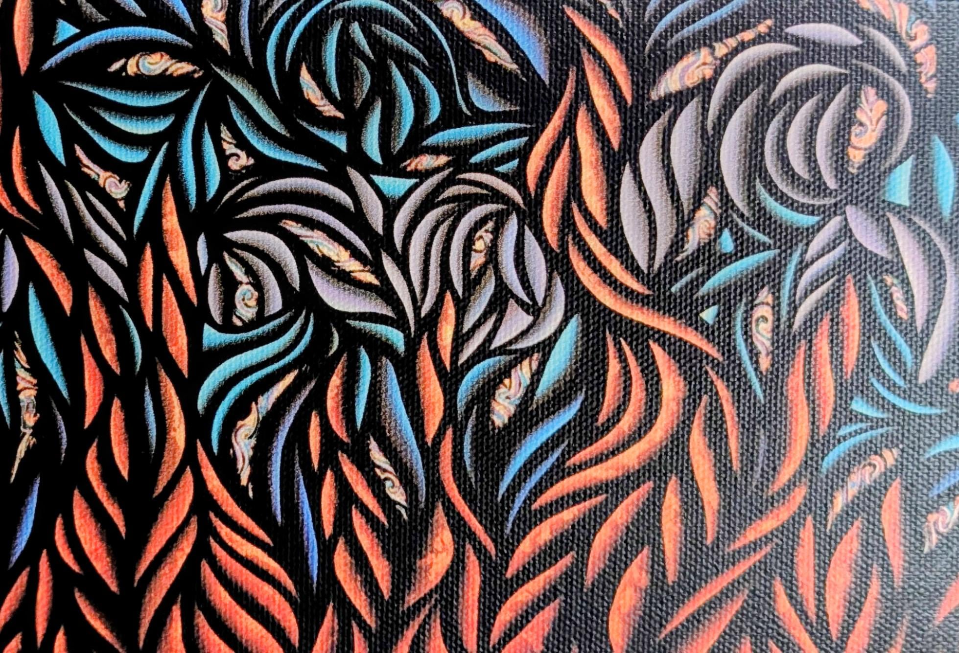 A nocturnal tapestry of flame-kissed foliage and liquid metallic echoes, Patina Night unfolds as a lush, maximalist abstract expressionist study. Bold, curving leaves intertwine in a dynamic rhythm, their edges etched in deep onyx with sweat-tinged highlights in copper, teal, and cerulean. The composition breathes with heat and movement, as if a dense forest has awakened under a patinated moon. Textural layering and high-contrast color shifts create a shimmering, almost sculptural surface that invites closer inspection. Created by Bex Nikols, this piece embodies the tension between organic abundance and disciplined brushwork that defines contemporary abstract expressionism.