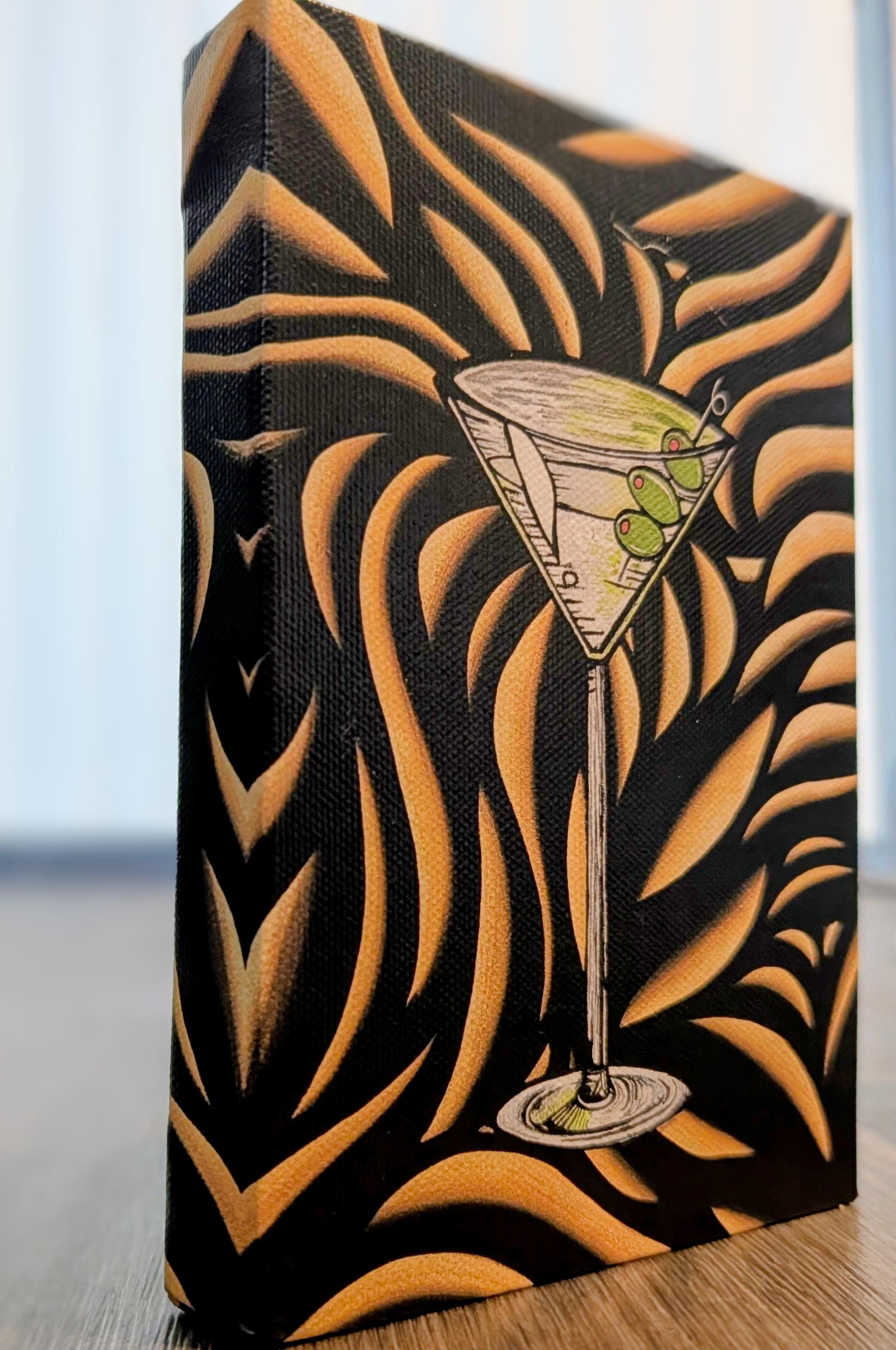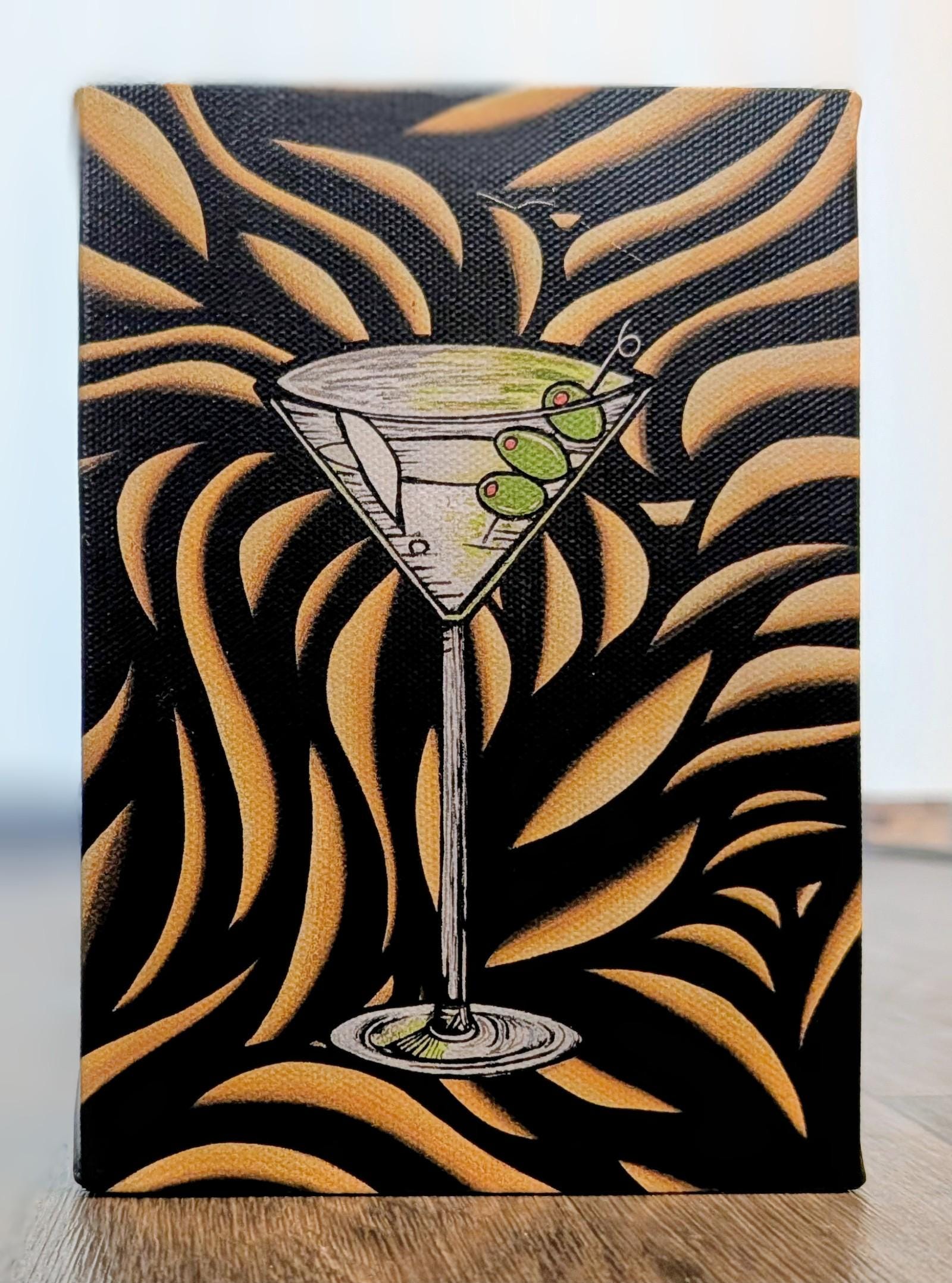 A playful, moment captured in bold maximalist style. The central motif is a graceful martini glass perched against a swirling, sun-kissed backdrop. Crisp lines and high-contrast shading give the glass a cool, crystalline glow, while a cluster of bright green olives on a skewer punctuates the rim with a cheeky wink. The background unfolds in fluid, flame-like waves of amber and black, creating a dynamic tension between structure and motion. Created by Bex Nikols, this piece blends cocktail chic with abstract exuberance, delivering a lively statement for contemporary interiors.