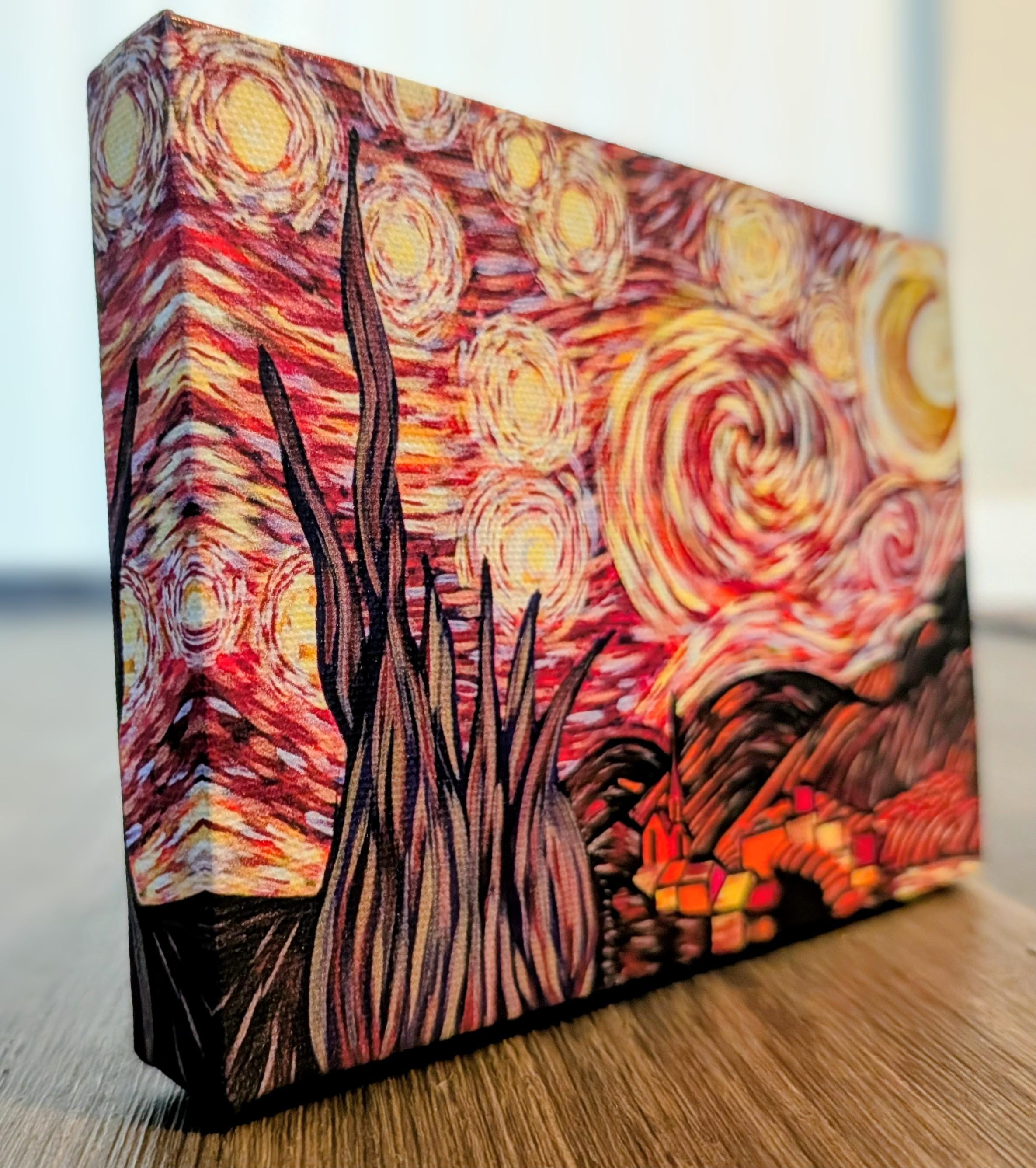 A vibrant fusion of iconic van Gogh energy and bold maximalist attitude. Starry Night at Sunset reimagines a rolling landscape under a swirling sky, where cerulean stars and luminous suns collide with a radiant sunset palette. The foreground features jagged, stylized cypress-like forms and a rough-hewn village silhouette, all rendered with expressive, tactile brushwork and energetic linework. The result is a dynamic dialogue between movement and stillness, night and day, chaos and harmony. Created by Bex Nikols, this piece channels the spirit of post-impressionist bravura through a contemporary abstract lens.