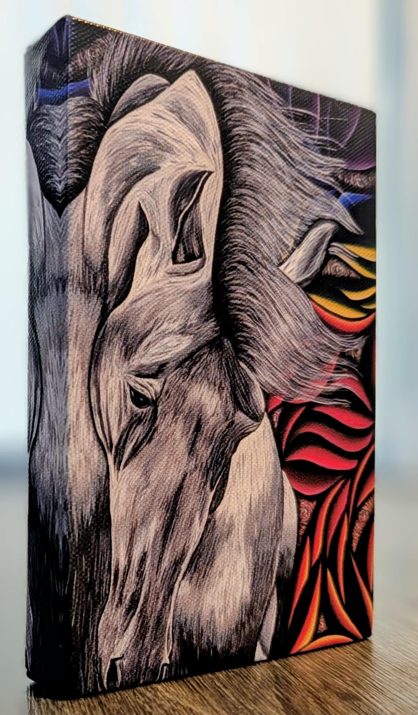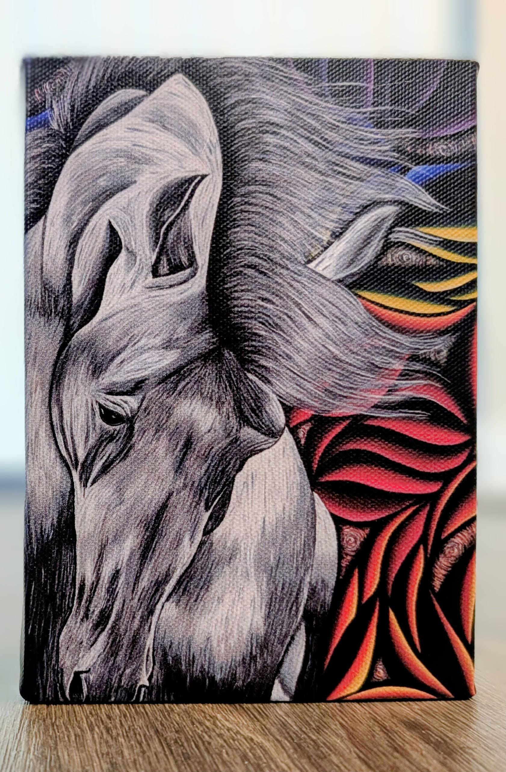 A bold, monochrome study set against a fiery sinewy backdrop. Feather presents a sculptural horse head rendered in cool grayscale tones, its lines and shading carved with precision to emphasize anatomy and movement. The background erupts in sinewy, flame-like tendrils of warm reds, oranges, and deep ambers, creating a dramatic contrast that makes the horse appear almost luminescent within the heat of the composition. The interplay between the calm, sculpted figure and the kinetic, fiery backdrop captures a tension between stillness and motion. Created by Bex Nikols, this piece embodies the fusion of classical form with maximalist, expressive energy.