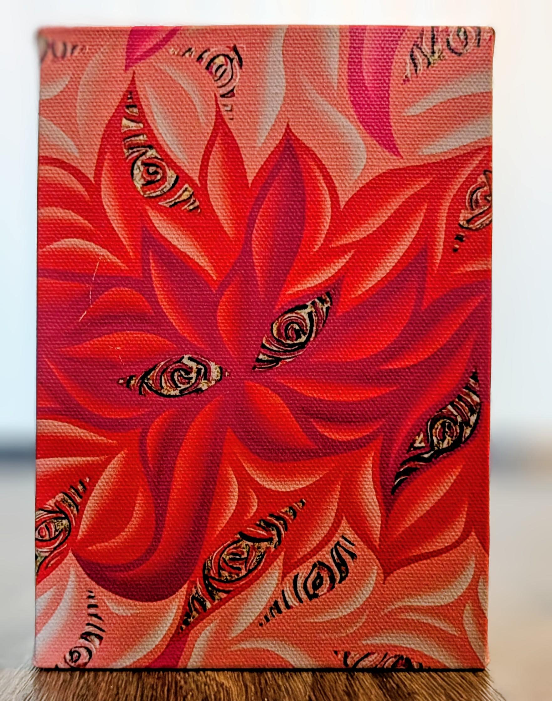 A vibrant, seed-to-flame explosion of warmth and whimsy. Pink Bloom threads a constellation of organic petals in radiant pinks, corals, and peach tones, all weaving toward a luminous central heart of saturated magenta. Subtle shading and crisp line work give the forms a sculpted, almost pulsing quality, while scattered black-and-white eye motifs add a playful, surreal twist. The composition balances feverish energy with a sense of floral rhythm, creating a bold statement piece for modern interiors. Created by Bex Nikols, this work embodies the maximalist impulse—rich color, tactile texture, and rhythmic motion.